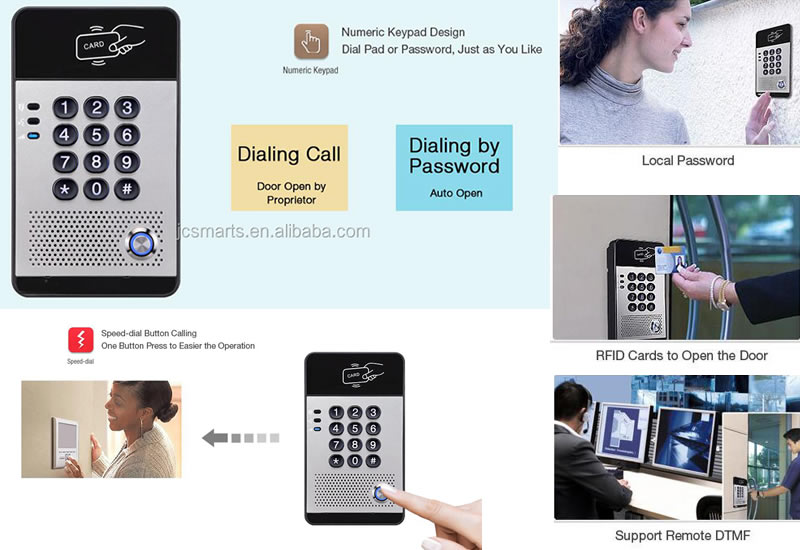 Equipos de portería IP/GSM para condominios de casas, edificios o torres con más de 5 unidades hasta 1000 unidades, puede llamar al monitor interior (opcional) o móvil en cada unidad. mientras que la unidad interior reenviará la llamada a la aplicación de teléfonos inteligentes; para que pueda atender su puerta en cualquier lugar. Poseen lector de tarjetas RF para control de acceso, cámara digital, visión nocturna (opcionales) según cada proyecto.